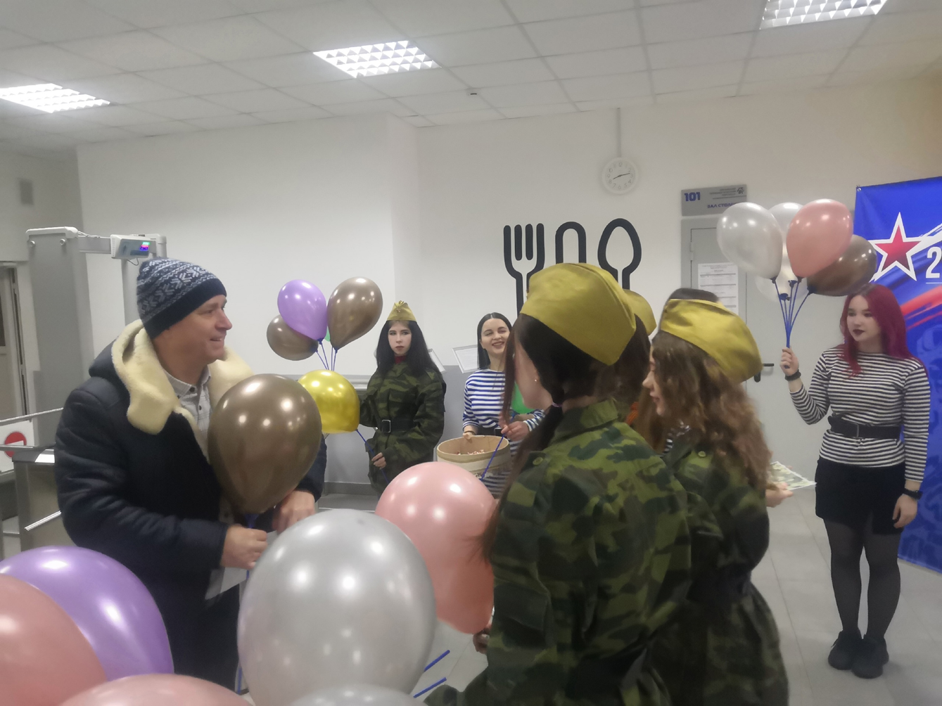 Прекрасная половина студенчества сегодня утром поздравила всех мужчин и юношей колледжа с Днём Защитника Отечества!