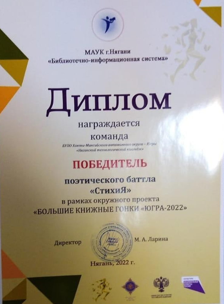 Студенты БУ "Няганский технологический колледж" приняли участие в поэтическом баттле "СтихиЯ" 11.10.2022г в рамках окружного проекта "Большие книжные гонки" Югра - 2022", в Центральной городской библиотеке студенты БУ "Няганский технологический колледж" приняли участие в поэтическом баттле "СтихиЯ"  и как результат Диплом победителя!