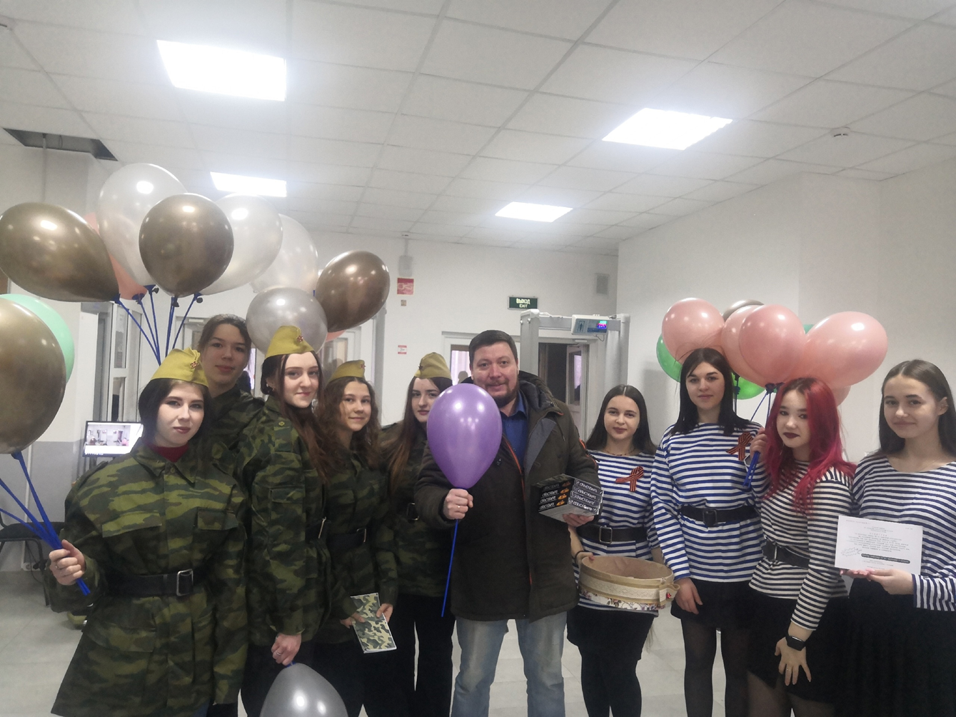 Прекрасная половина студенчества сегодня утром поздравила всех мужчин и юношей колледжа с Днём Защитника Отечества!