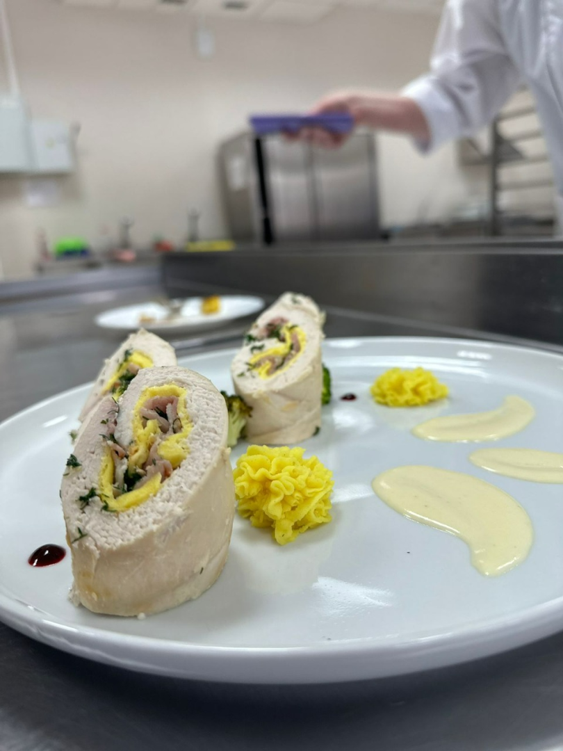 Участники выполняли конкурсное задание: Приготовить горячее блюдо из птицы (курица) с двумя гарнирами и горячим соусом в авторском исполнении.